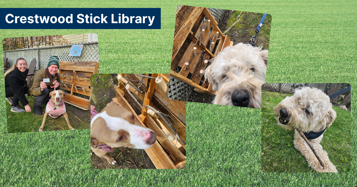 If you’re taking your furry friends for a walk in the Crestwood neighborhood, check out our stick library. Outside in our garden, we have a collection of sticks that are great for playing fetch. Pets are patrons too, and we encourage you to borrow and return sticks to the stick library!